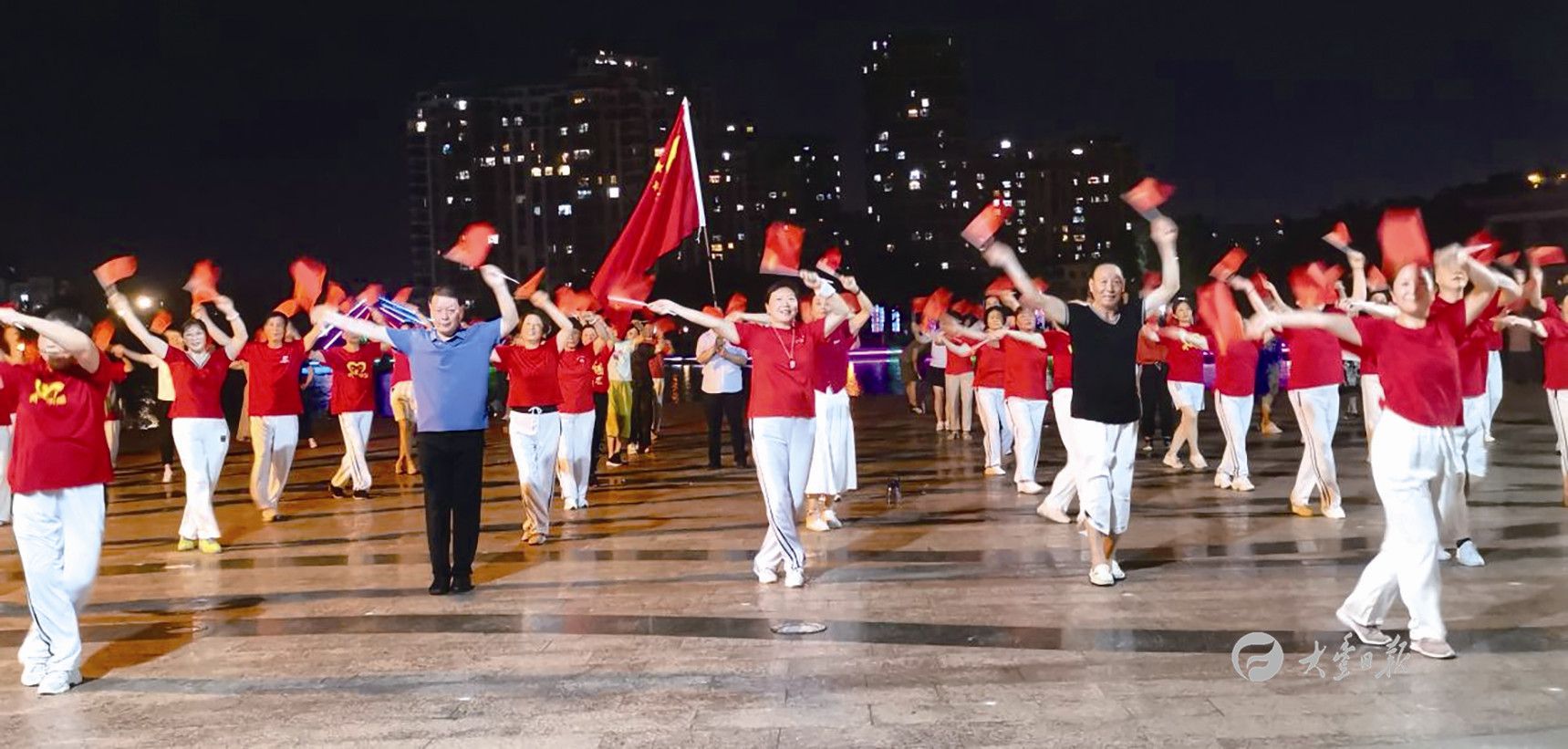 7月1日是伟大的中国共产党成立104周年纪念日,当晚在银杏湖公园,来自附近小区的党员干部和参加广场舞活动的市民们挥舞党旗国旗,高唱《没有共产党就没有新中国》等歌曲,载歌载舞颂党恩。