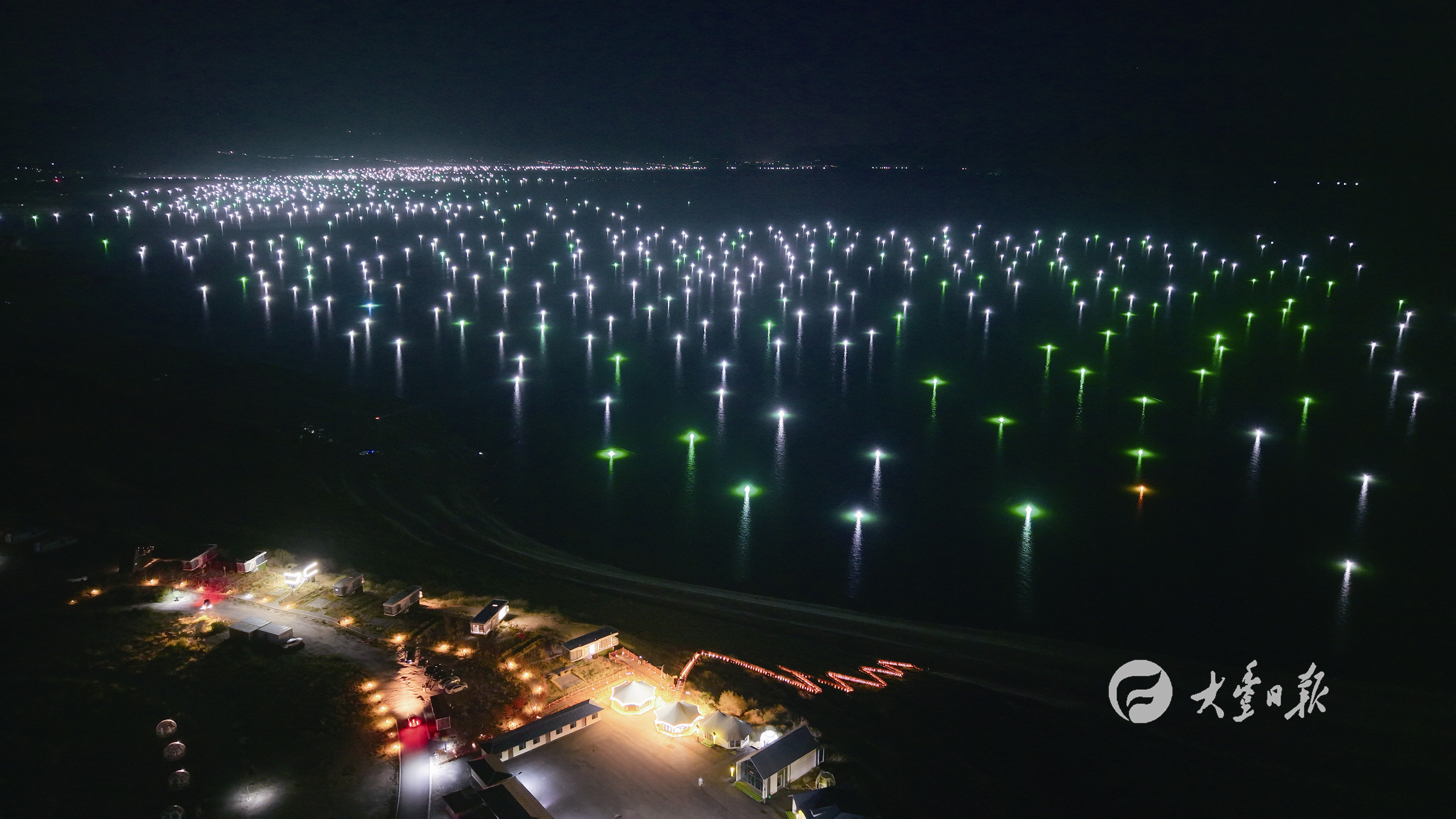 10月17日,拍摄于青海省海南藏族自治州共和县的恰恰湾沙滩旅游度假村(无人机照片)。位于青海省海南藏族自治州的龙羊峡库区地处黄河上游,依托库区丰富的冷水资源和优越的生态环境,当地发展起小银鱼特色渔业。每年8月底至11月末是小银鱼的捕捞季,渔民借助闪烁的渔灯诱鱼,凌晨捕捞、拂晓而归。